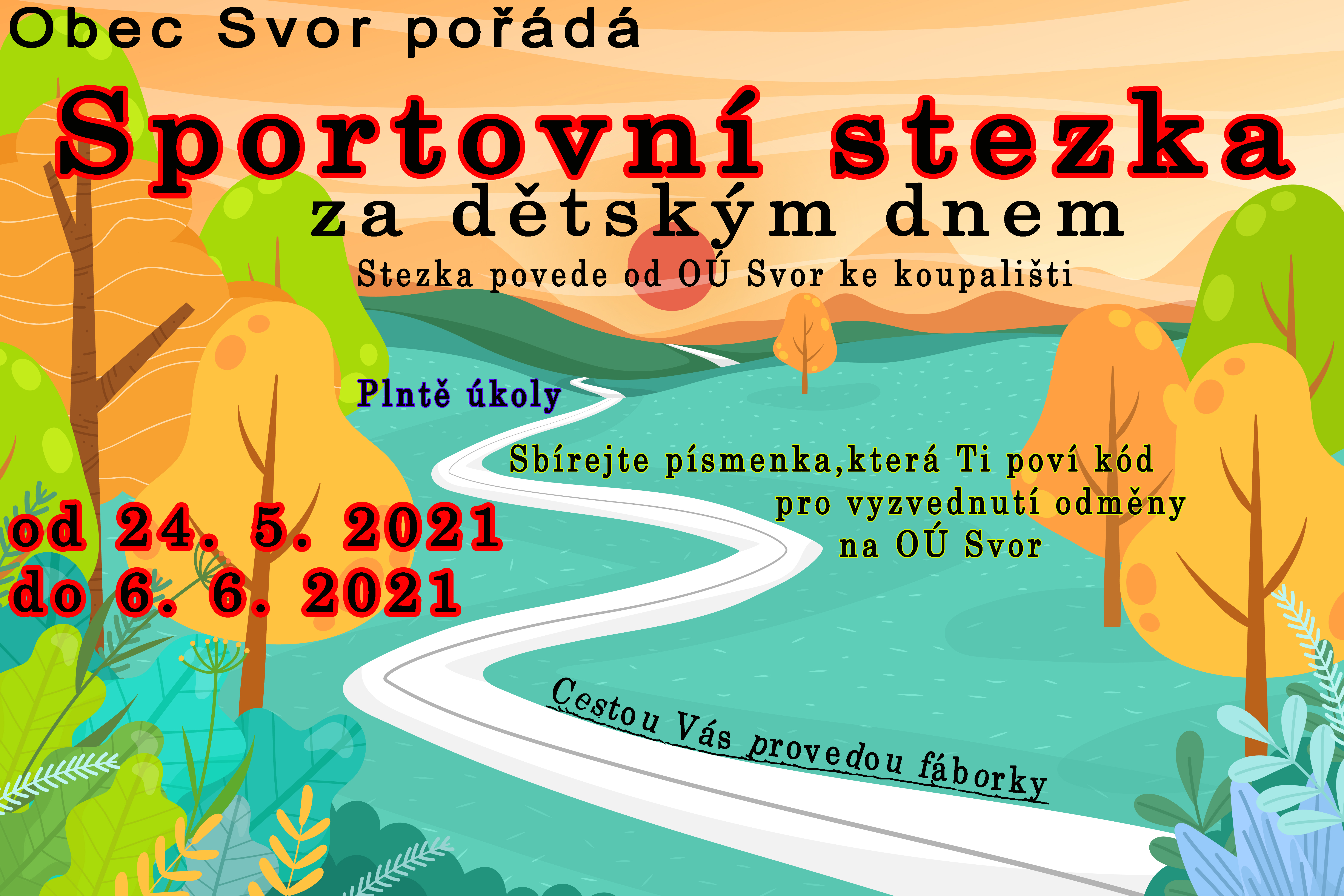 Sportovní stezka za dětským dnem - trasa od Obecního úřadu ke koupališti. Individuální možnost absolvování stezky s vyzvednutím odměny na obecním úřadu v úřední dny (Pondělí, Středa).